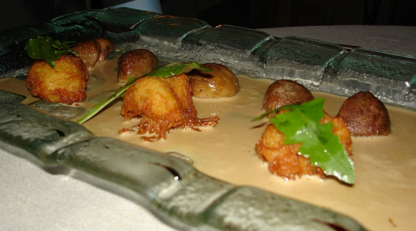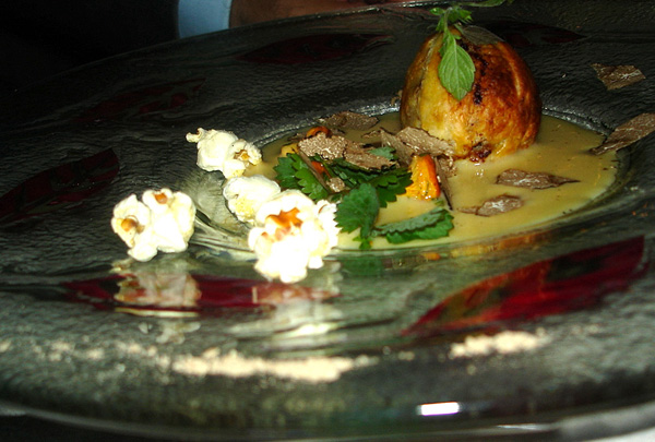 Ci corrompe, a comanda fatta, con uno stupefacente TRUFFE D’ETE’ EN CROUTE RELEVEE’ D’UN COULIS DE MAIS TRUFFE’, POP CORN ET FEUILLE DE PIMPRENELLE , QUELQUES GIROLLES CRUES CROQUANTES EN VINAIGRETTE DE TRUFFE, dove il benedetto tartufo nero estivo è addirittura uno, intero e sembra una balla di toro, la salsa è perfetta e salta nel palato grazie alla pimpinella, i finferli crudi in balsamico fanno il resto. Grande piatto. Il guardiano comincia concionare che questa E’ GRANDISSIMA CUCINA VEGETARIANA . Non posso dargli torto, neanche un’unghia di torto.
