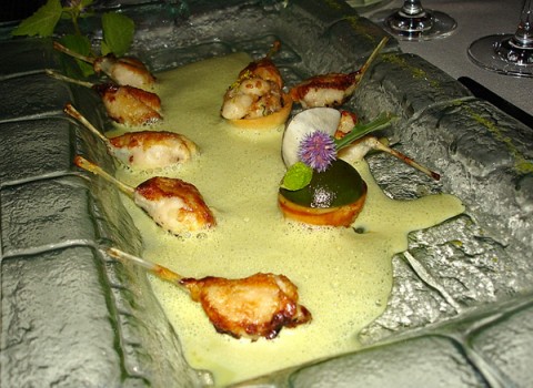 Quanto a la Cuisse de Grenouille, Tartelette de Roquette au Raifort,Craquant de Radis Noir Cru, non andrei oltre a dire che il piatto da vedere si direbbe stuzzicante e goloso. Invece quello che ti aspetti piacevole e ruffiano qui ti prende a schiaffi dall’inizio alla fine. Salsa emulsionata a parte, gradevolissima, leggera, acida il giusto e sapida in compensazione al tono curiosamente amaro portato dall’aromatizzazione delle coscette di rane arrostite fino alla caramellizzazione degli zuccheri naturali, I due scodellini dall’aria docile levano due manrovesci che me li ricorderò per un po’. Tra l’amaro piccante della rucola e delle radici di rafano oltre ad altre radici più scure lo choc è degno del giovane Loubet, quello che un dozzina di anni fa mi fece piacevolmente inç@##@re dall’inizio alla fine con un menù a soglia zero di sale e zucchero, e dove tutto giocava intorno all’acido amaro spietato.