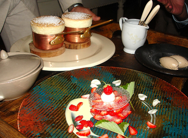 Preparazione al gueridon dei soufflè e presentazione della cristallina di fragole di bosco alle rose.