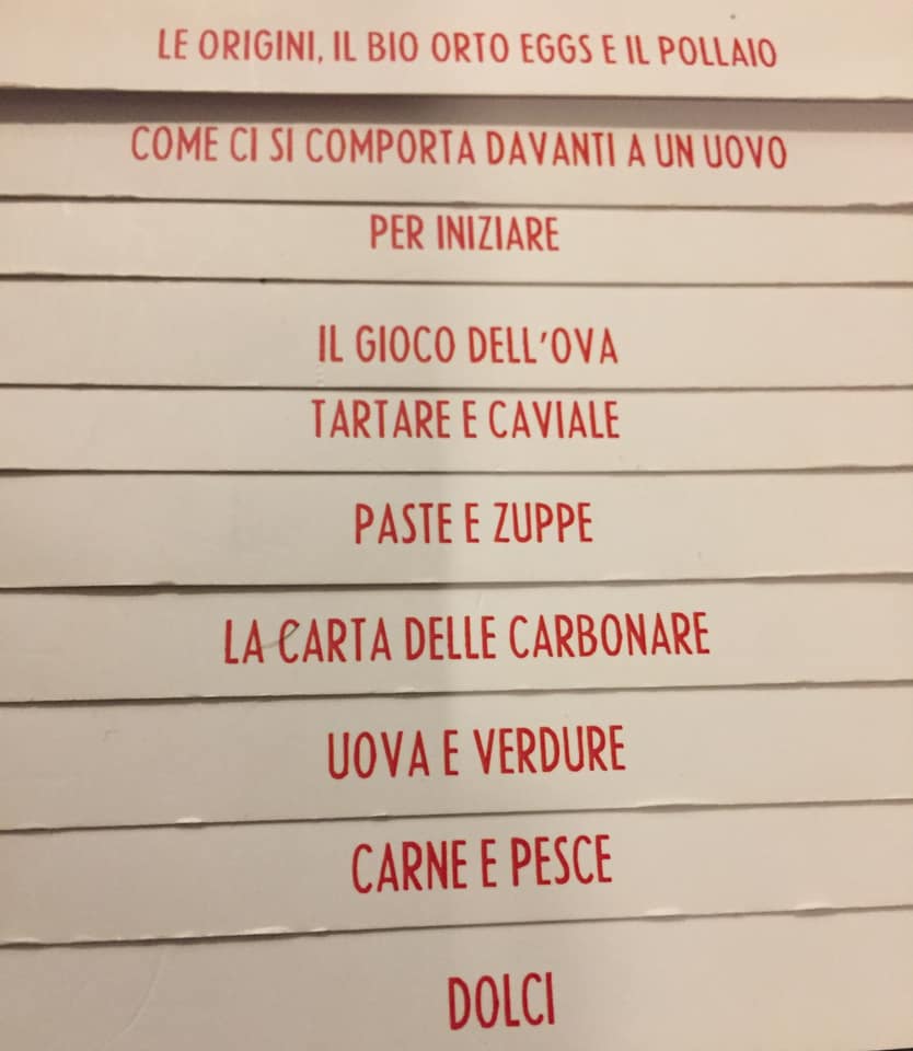 Il simpatico menu a tendina prevede le prime sezioni dedicate all’uovo e alle sue declinazioni, quelle dedicate alle zuppe, alla pasta, alle carni e al pesce. Di molti prodotti sono indicati origine e aziende; le uova di gallina sono biologiche; la pasta all’uovo è fatta in proprio, il pane è di Roscioli.
