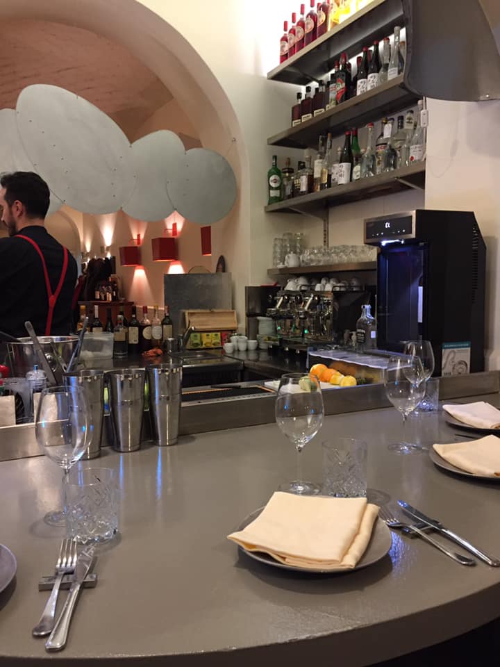 Un bel locale moderno, pulito, essenziale, con qualche tocco di design che non guasta; un banco con sgabelli comodo e ben organizzato, che non vi farà rimpiangere il tavolo. Anzi. Da qui può godere della vista del simpatico bartender e seguire il buon ritmo di cocktail e comande di una sala molto ben gestita.