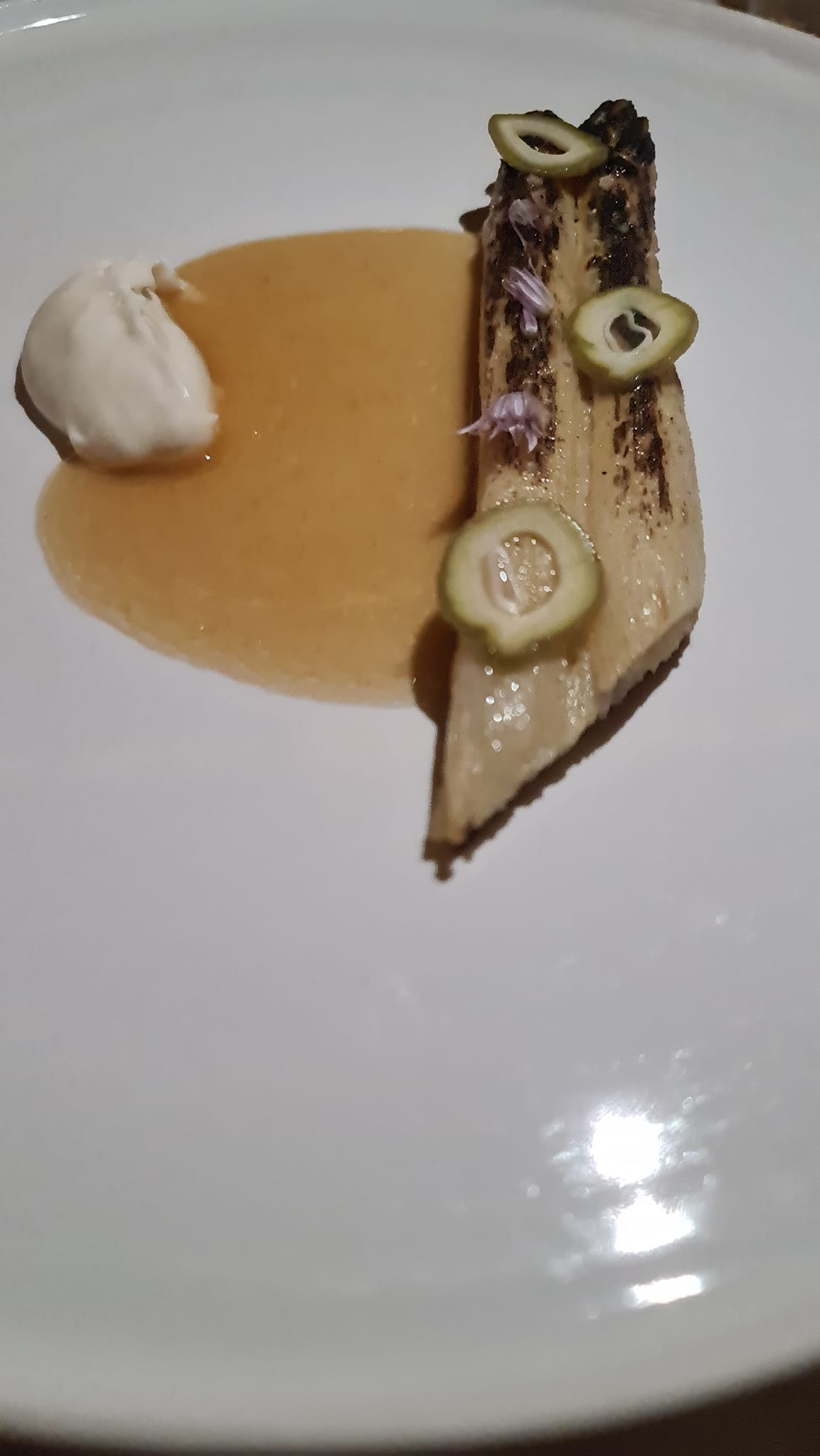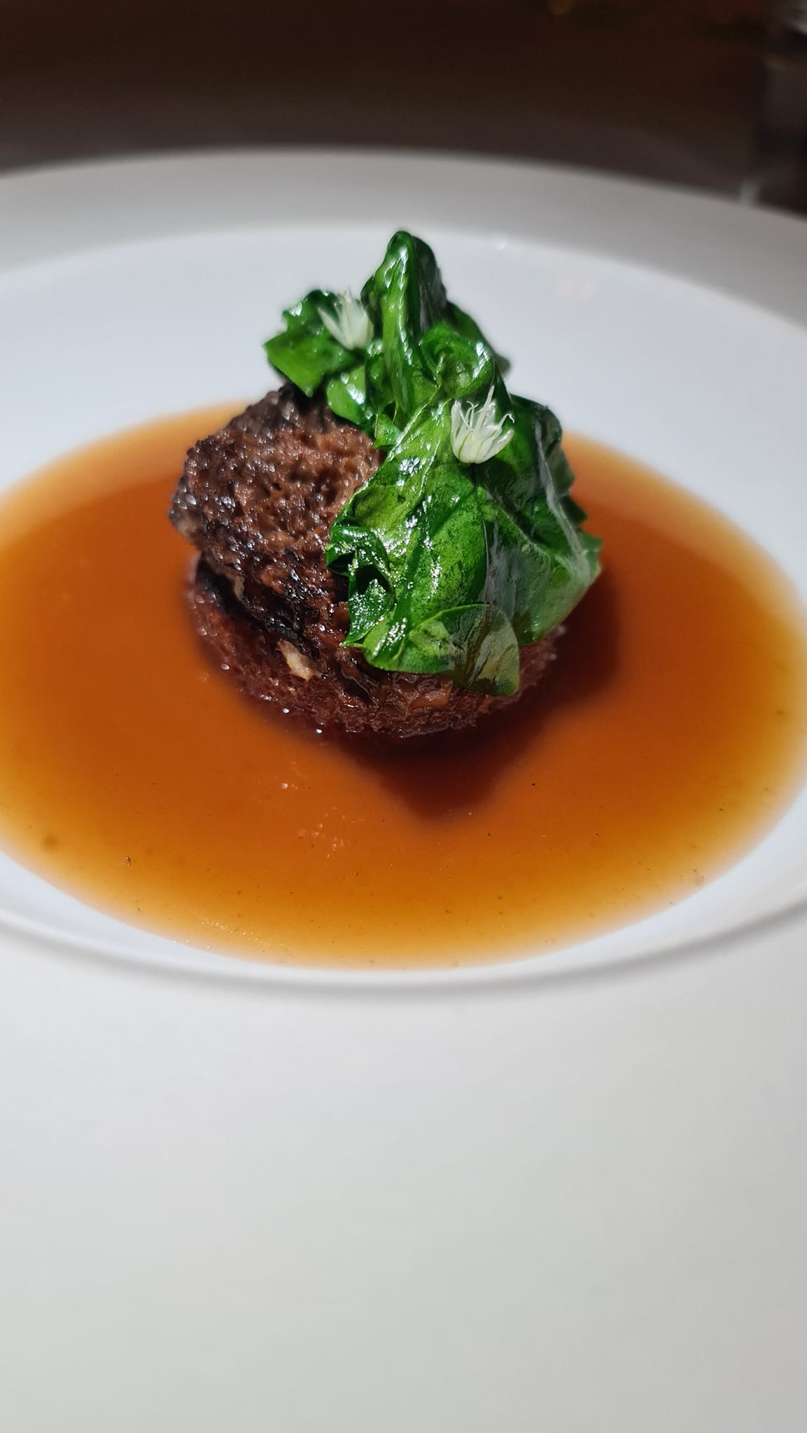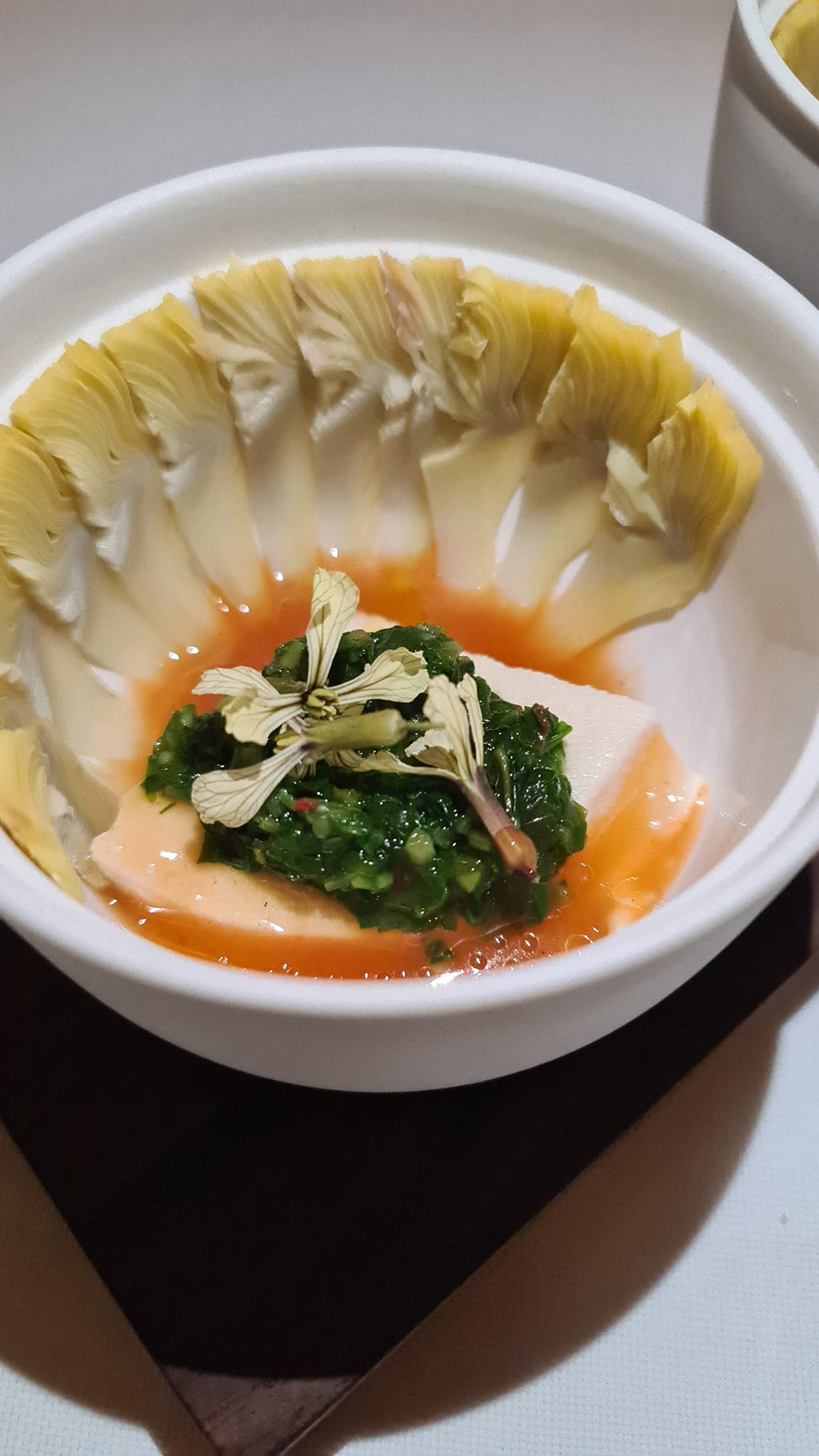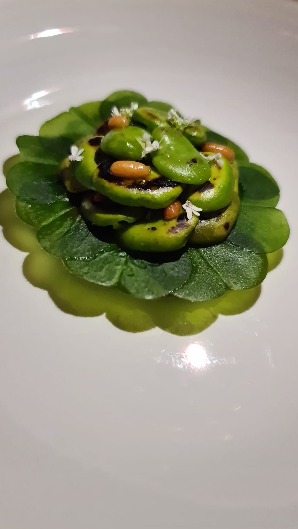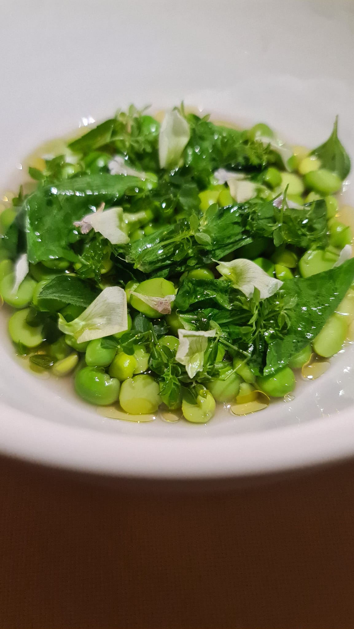 La cena parte con tre assaggi di asparago., fritto e in due versioni, molto eleganti le presentazioni, con leggera fermentazione e marinatura. Buono, senza entusiasmo. Il tomburi con la lattughina fresca e croccante, i semi che ricordano visivamente il caviale e la crema di mandorle con la tostata e i ravanelli tagliati molto sottilmente è forse il piatto più convincente dell’intera cena. C’è profondità nel gusto, senso di divertimento nel mischiare gli ingredienti, il cambio di ritmo è continuo. Blistered fava beans, with chickpeas and Sorrel, valorizza il senso di tostato delle fave, divertente, da mangiare come un tacos. Peas, glazed with brown rice, coconut and Nepitella. I piselli sono molto dolci, ben trattati. Comincia a pesare il fatto che non ci sia un piatto caldo, tutti ingredienti assemblati con preparazioni precedenti. Fresh tofu with artichoke, arugula and green garlic. Un piatto scorbutico, perchè i carciofi sono troppo cotti e più che dare il loro sapore caratteristico, appiatiscono il sapore facendo risaltare troppo il gusto del tofu. Il pane, molto buono, è accompagnato da un burro fatto con vari oli vegetali e insaporito con un essenza di funghi. Non era cattivo, però qui si sono voluti complicare troppo la vita, perchè se fai cucina vegetale, metti a tavola il principe dei condimenti, uno straordinario olio extravergine d’oliva e amen. I due secondi sono la parte più complicata della cena. Morels, with braised seitan, spinach and spring onion. I funghi vengono trattati come per ricordare la carne, nella consistenza e nella sensazione di umami, più che far venire fuori l’essenza di questo alimento, scelta al quanto discutibile. Stesso discorso per i Grilled white asparagus, with potato green almond and ginger. Se deve ricordare la carne, meglio mangiare la carne. Non ne ho capito il senso onestamente. Con i dolci si alza di nuovo il tono della cena, freschi complessi, senza zucchero in eccesso, davvero buoni.