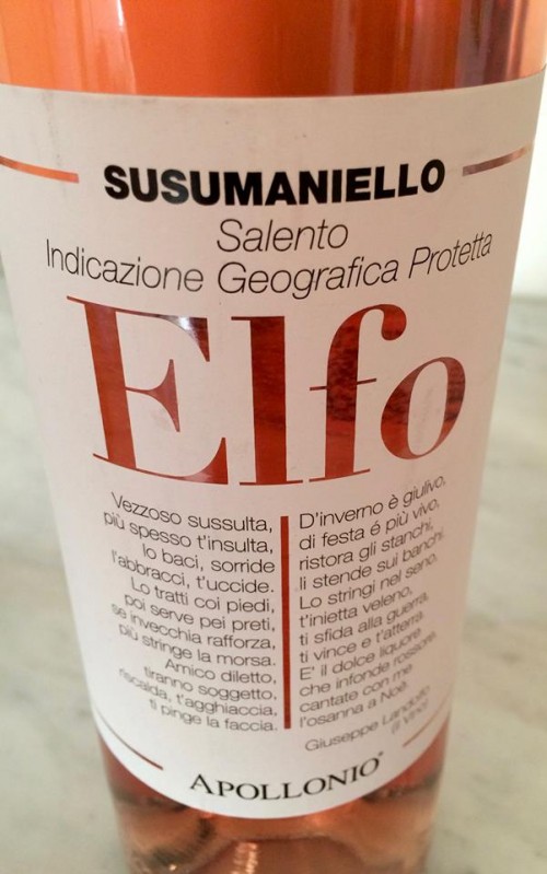 Appena nato in casa Apollonio e già fa parlare di sè; è il freschissimo Elfo rosato 2015 da premitura soffice di Susumaniello, un vitigno che sempre più si sta diffondendo, anzi, recuperando, si, perché era già presente nei vigneti del nord Salento; un rosato dai profumi puiti e vibranti di agrumi, ribes e ciliegia, un colore tenue ma dai riflessi vivaci di rosa corallo; notevole è al palato dove esprime una buona struttura acida, tutta a vantaggio della bevibilità, con un finale succulento , sapido e con un frutto rosso che non abbandona mai il palato.