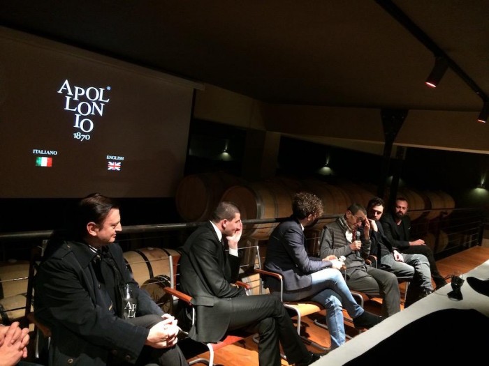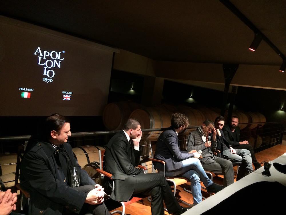 Il palcoscenico della serata è la maestosa bottaia che ospita quasi mille barrique, tutte ordinate come tanti piccoli soldatini e, nascosto fra i pregiati legni, una tavola ben apparecchiata, dove i fratelli Apollonio abitualmente ospitano amici e clienti.