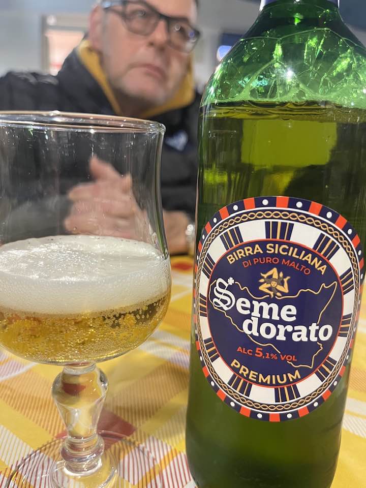 Ci sediamo e subito ci arriva un arancino fumante con un sorso di birra Semedorato, birra siciliana fino al midollo con malti autoprodotti, che si rivela piacevolissima compagna della cena.