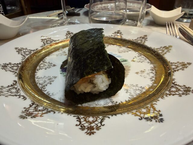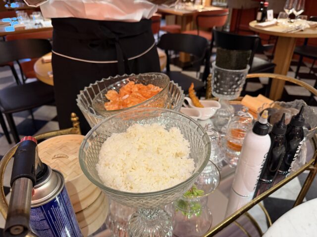 Tra le esperienze più scenografiche del ristorante spicca il Temaki Cart – il temaki è il sushi a cono realizzato con alga nori – un vero e proprio show cooking a tavola durante il quale lo chef prepara i temaki in diretta, trasformando ogni cono di sushi in un piccolo capolavoro di tecnica e creatività.