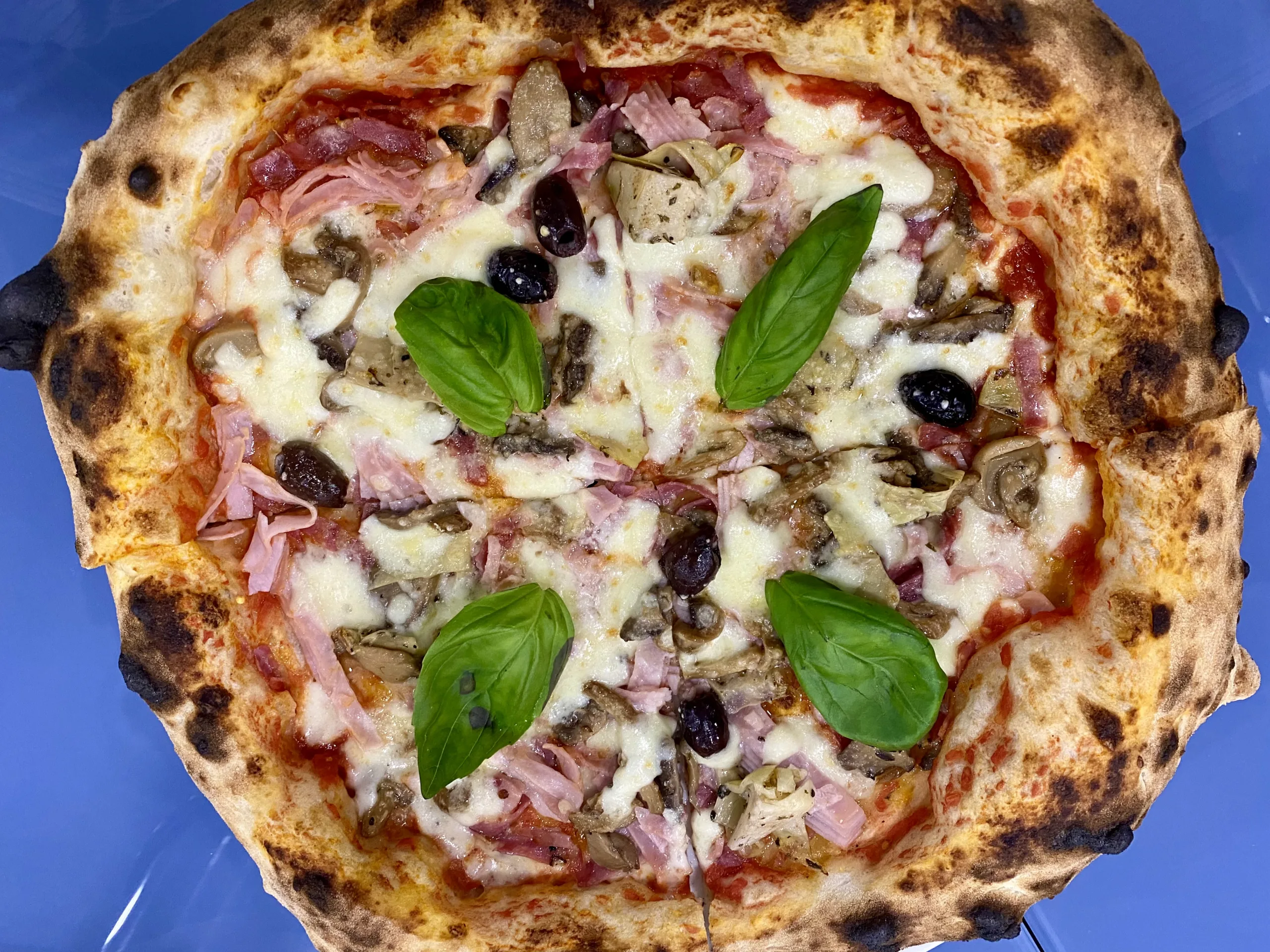 Capricciosa: Pomodoro San Marzano Dop, Fior di latte,prosciutto cotto, salame napoli, funghi championm, carciofini sott’olio, olive nere caiazzane , basilico e olio evo