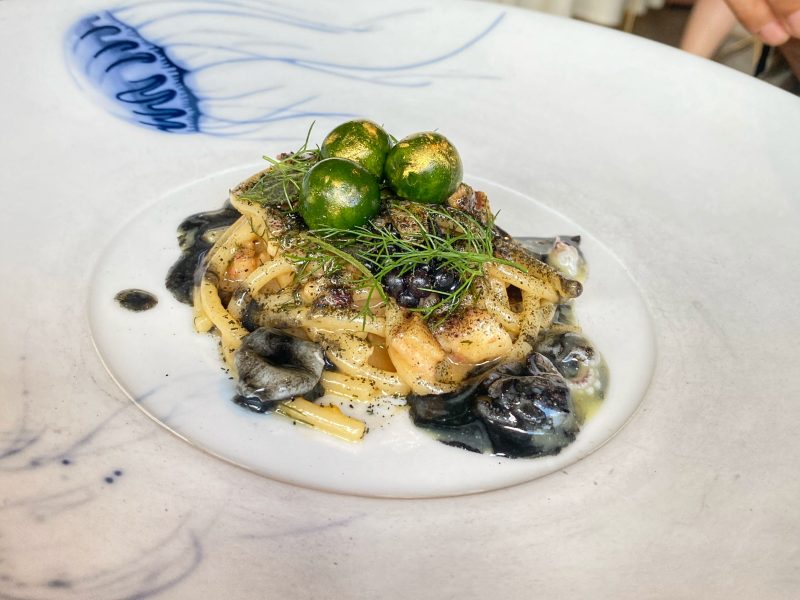 Quello che colpisce è la grande attualità di ogni piatto con dei primi, oltre al già citato risotto, che valgono da soli il viaggio. L’Italia dei grandi pilastri gastronomici quali riso, pasta all’uovo e soprattutto pasta secca, qui è interpretata ad altissimo livello. Con la stessa precisone e con l’identica volontà di offrire un’esperienza palatale complessa ma leggibile, golosa ma con spinte fresche, da mangiarne in porzione degustazione ma che non temono in nessun modo il piatto grande in un percorso di poche portate. Parliamo dei Bottoni di olio e lime in salsa caciucco e polpo e dello Spaghettone all’anguilla affumicata e calamaretti spillo all’alloro.
