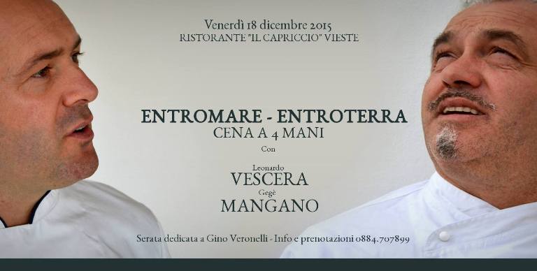 In un Gargano avvolto dalle oniriche atmosfere invernali, in cui la meravigliosa bellezza che abita questi luoghi diventa ancora più rarefatta e struggente, tale da trasformarsi in una temporanea condizione mentale per chi vi risiede, l’appuntamento con la cena a 4 mani degli chef Leonardo Vescera e Gegè Mangano, intitolata “Entromare-Entroterra”, appare adesso come un’autentica e preziosa rivelazione.