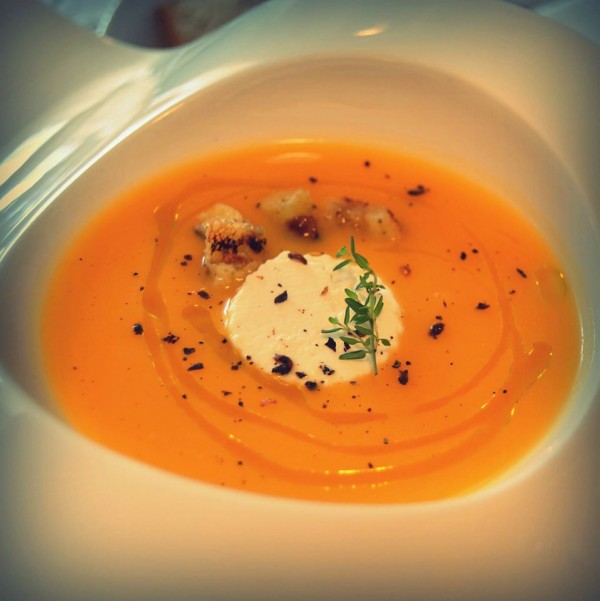 Vellutata di zucca con spuma di ricottina e dadini di pane alle acciughe