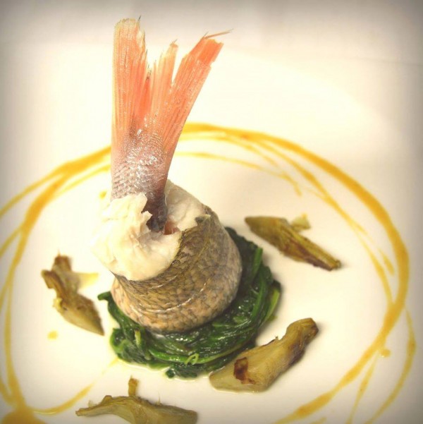 Pezzogna, bufala, limone, salsa di crostacei e carciofi croccanti