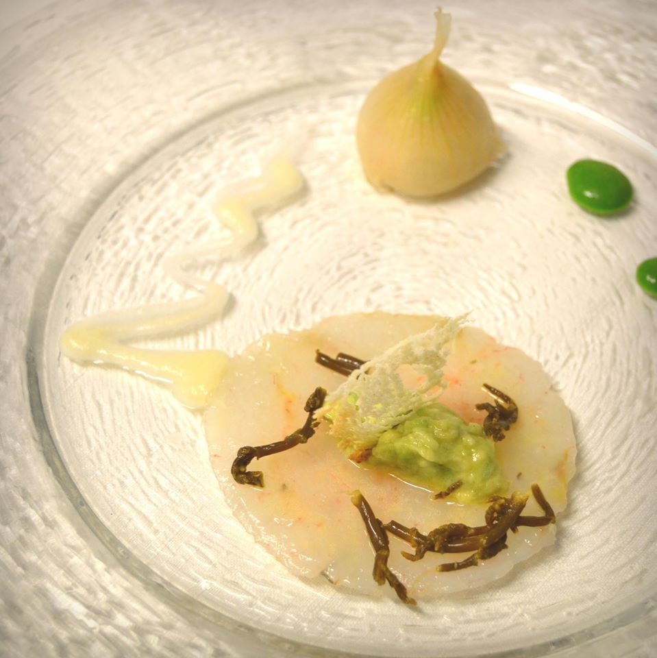 Variazione sul gambero rosa, salicornia e la cipolla di Margherita di Savoia