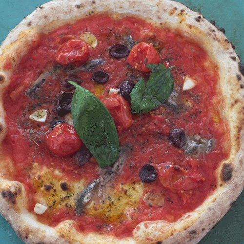 Napoletana Vesuviana con pacchetella del Vesuvio, San-Marzano, aglio dell’Ufita, Origano del Vesuvio, alici di Cetara e olio Nocellara del Vesuvio