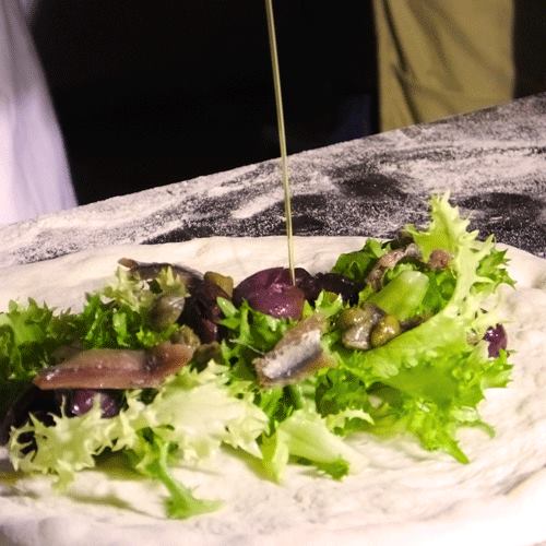 Il nostro bravo “scugnizziello” della Sanità non si è tirato indietro all’appuntamento di Festa a Vico portando la Frezzella. Una pizza ad anello tagliata a metà e guarnita come la fresella in una ricchissima caponatina napoletana. La matrice dei quartieri storici partenopei qui è tutta leggibile nella ricchezza del condimento di quello che è uno dei piatti unici estivi. Rucola, mozzarellina di bufala campana dop, pomodori e tonno tutti freschi giocano un bellissimo contrasto con la base calda della frezzella. Bravo Ciro. Sempre in gamba.