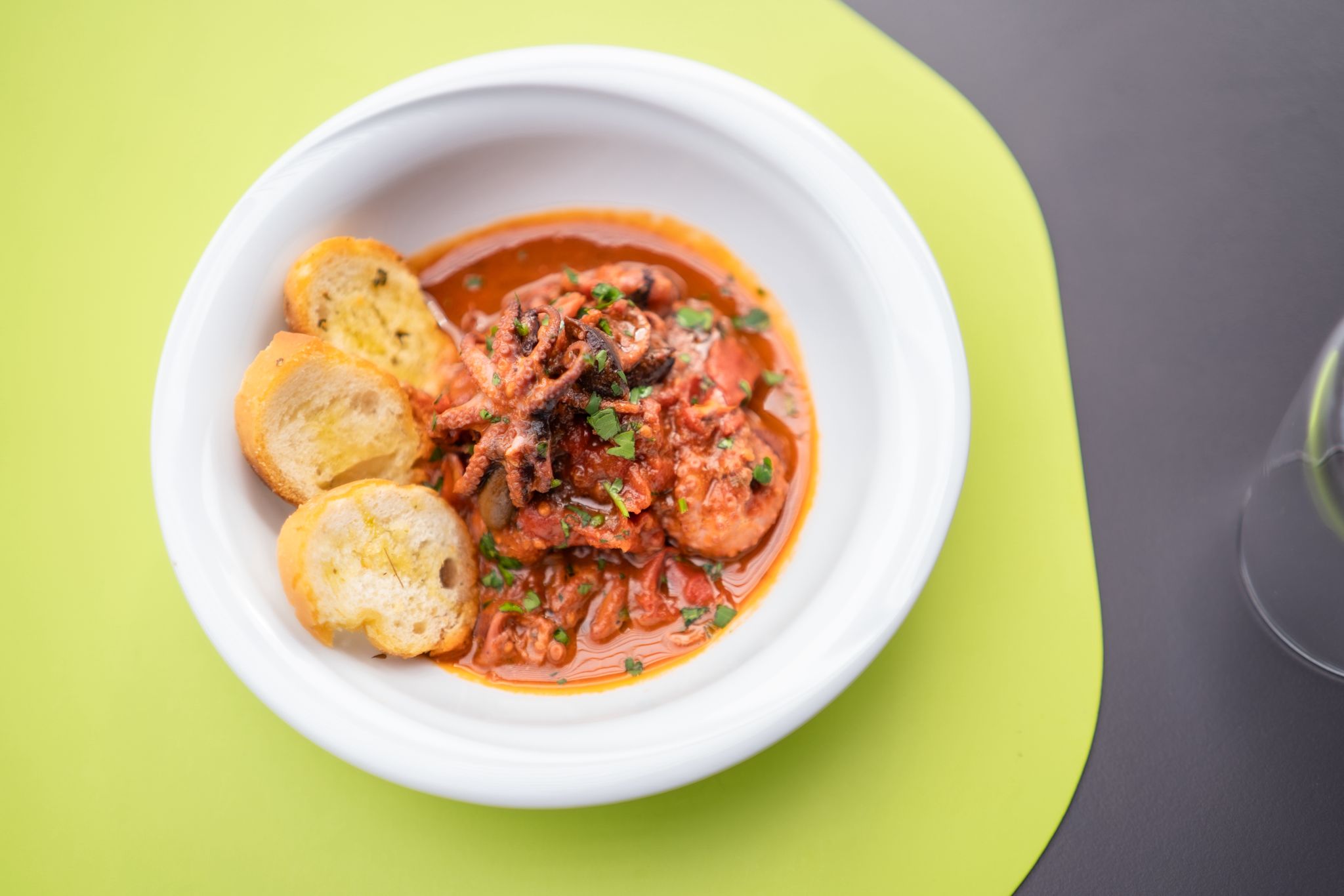 Il bistrot, con una capienza di circa quaranta posti a sedere, si sviluppa nel dehor dell’area bar. Le ampie vetrate, circondate da piante sempreverdi, richiamano l’idea green di Etè Station, ulteriormente valorizzata dal verde acido, leitmotiv che caratterizza l’intera struttura.