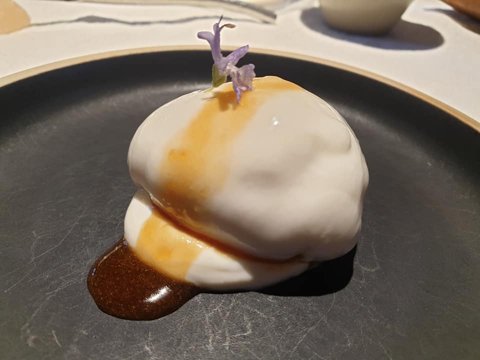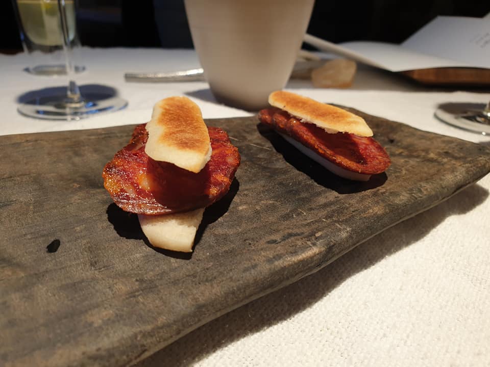 Veniamo al nostro pranzo. La sala è calda e accogliente. Legno, pietra, un grande camino all’ingresso. Il servizio è informale, ci si sente davvero a proprio agio. La carta dei vini è molto interessante, con dei ricarichi da enoteca, soprattutto sui vini di Borgogna. Per sintonizzare il palato ci viene servito un brodo di piselli con fiore di mostarda. L’ingresso è un piccolo panino con il chorizo, un’acciuga leggermente marinata e poi una mozzarella a latte di bufala con una riduzione di pomodoro passato alla brace. Una mantequilla de cabra, al posto bel burro. La prima considerazione personale: di mozzarella di bufala ne ho provate tante nella mia vita, ma questa era davvero buona. Si sentiva il latte. Il grasso del latte della bufala in tutta la sua pienezza, così elegante, semplice e geniale allo stesso tempo, nell’abinamento, da sentirmi quasi imbarazzato.