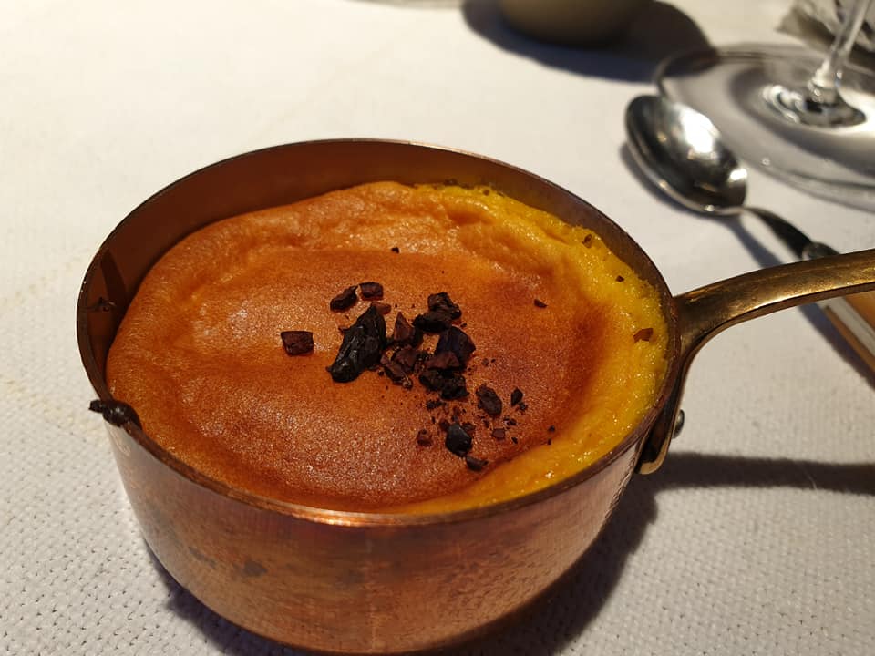 Gelato di caglio con succo di fichi ristretto sulla brace e souffle di zucca con cacao, sempre sulla brace a terminare.