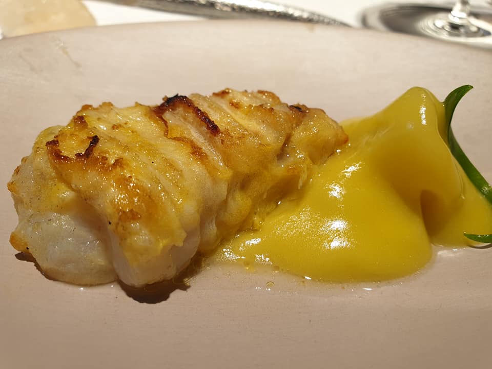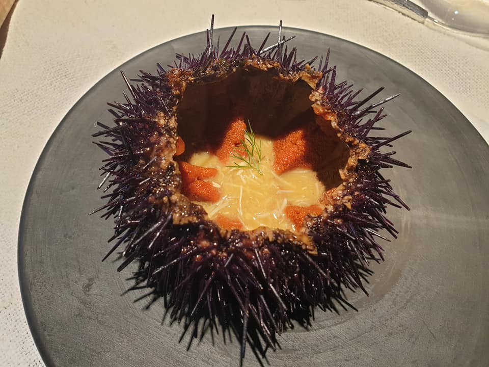Entriamo nel vivo del pranzo con le berberechos caldo de pochas. Delle vongole con un brodo caldo di fagioli. Spiazzante, con un gusto affumicato tanto elegante da somigliare alla migliore versione di Unforgettable cantata da Nat “King” Cole. Con i “gambas de Palamos” e con “erizo de mar con centolla“, entriamo della goduria libidinosa, quella che prende alla pancia e alla testa. La materia è straordinaria, lessenzialità e l’eleganza pure. Niente da dire se non “disfrutar” (godere, ma tanto). Kokotxa y callos de baccalao con pil-pil, gola e trippette di baccalà con l’immancabile, per i Paesi Baschi, salsa pil-pil.