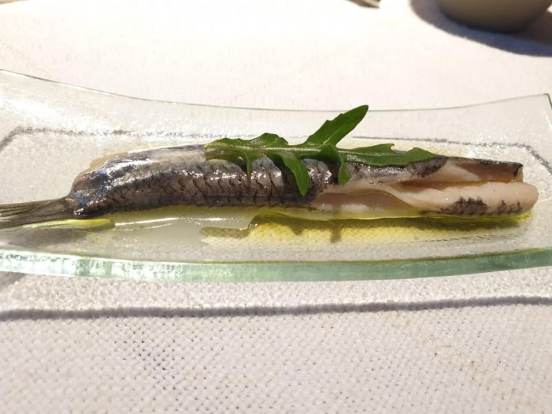 Veniamo al nostro pranzo. La sala è calda e accogliente. Legno, pietra, un grande camino all’ingresso. Il servizio è informale, ci si sente davvero a proprio agio. La carta dei vini è molto interessante, con dei ricarichi da enoteca, soprattutto sui vini di Borgogna. Per sintonizzare il palato ci viene servito un brodo di piselli con fiore di mostarda. L’ingresso è un piccolo panino con il chorizo, un’acciuga leggermente marinata e poi una mozzarella a latte di bufala con una riduzione di pomodoro passato alla brace. Una mantequilla de cabra, al posto bel burro. La prima considerazione personale: di mozzarella di bufala ne ho provate tante nella mia vita, ma questa era davvero buona. Si sentiva il latte. Il grasso del latte della bufala in tutta la sua pienezza, così elegante, semplice e geniale allo stesso tempo, nell’abinamento, da sentirmi quasi imbarazzato.