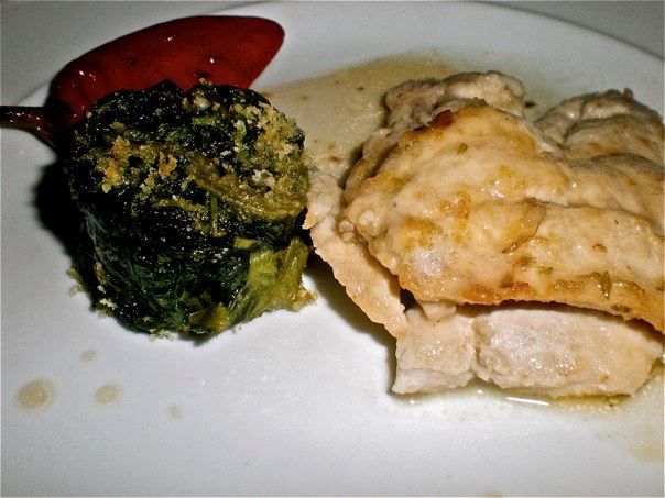 Segue un altro piatto di mare con la Lampuga saltata detta localmente “Capuni (capone)” con un tortino di bietole accompagnati dalla forza e l’eleganza del gaglioppo del Duca San Felice di Librandi.