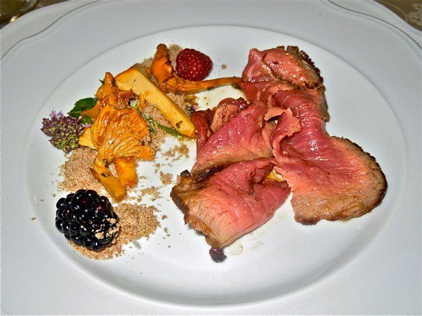 Pulita la bocca con il sorbetto al Bergamotto, con il suo sapore di dopobarba anni ’80 ben mitigato, è la volta di sua maestà la Mucca Podolica, il bovino ormai conosciuto e valorizzato in tutto il sud e che in Sila e sul Pollino è stata, negli ultimi secoli, fonte di forza, latte e carne. Proposta arrosto accompagnata da funghi, frutti di bosco, polvere di castagna, origano selvatico e il magliocco dolce di Poderi Marini.