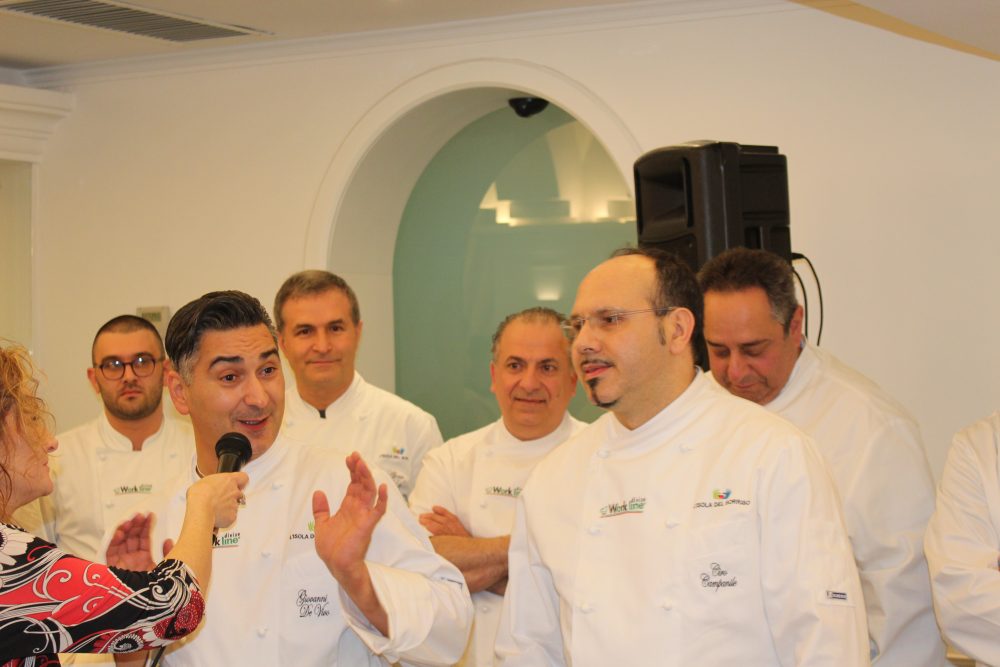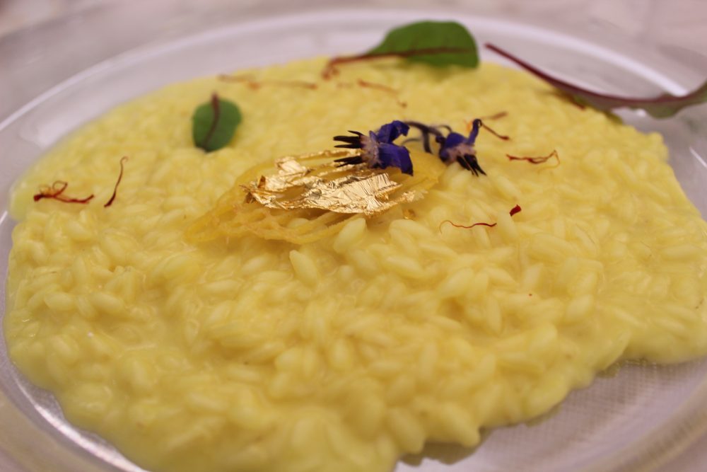 proseguendo un primo piatto dello Chef stella Michelin Giovanni De Vivo (Il Mosaico – Terme Manzi – Ischia) – Chef Ciro Campanile (Ristorante Elisabetta) con un “Risotto omaggio a Marchesi nell’innovazione” Oro e zafferano ed in abbinamento: Cantine Cennerazzo – Torrioni AV Greco di tufo Docg annata 2015