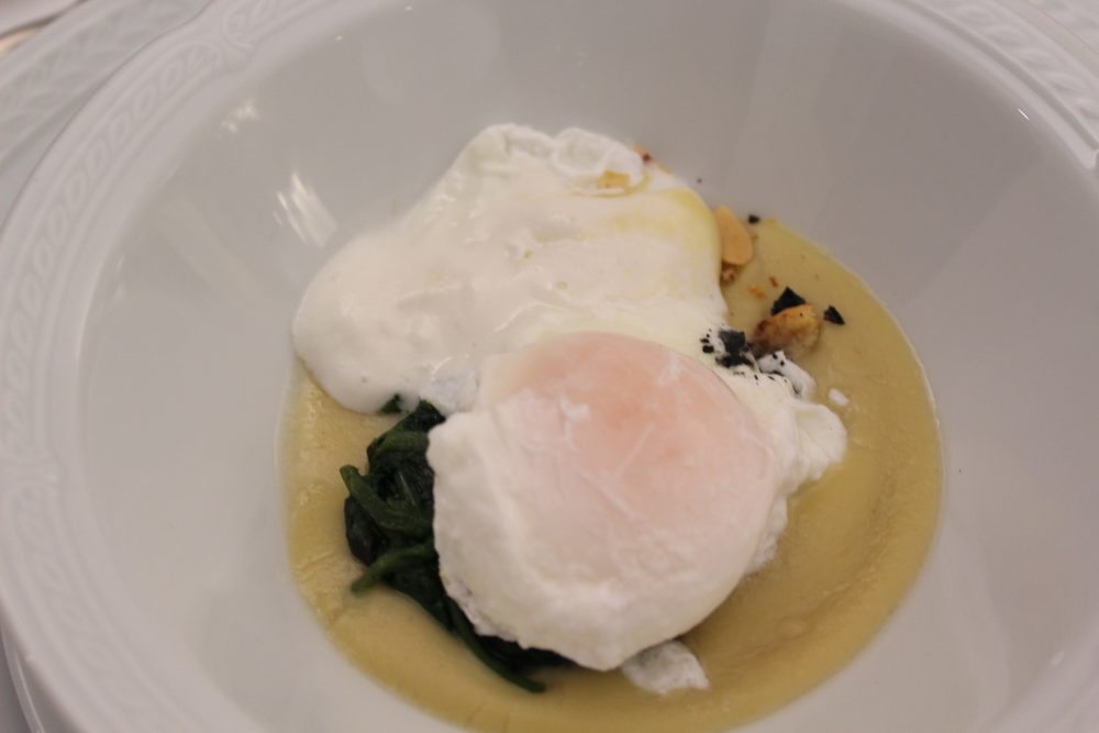 (Rossellinis – Palazzo Avino – Ravello) – Chef Giovanni Ripa (Sun’s Royal Park – Caserta) con un uovo 65°, Crema di fave secche, cicoria selvatica, spuma di ricotta salata e polvere di tarallo con un Fiano 2016 (Melodia) Igp Colli di Salerno della cantina Casula Vinaria di Campagna (SA) in abbinamento;