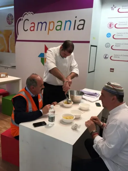 Il primo piatto dell’Expo è lo spaghetto alla ciolatura di alici. Protagonisti Pasquale Torrente del Convento e Oscar Farinetti.