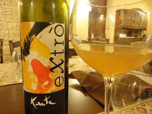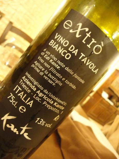 Ha forma ellissoidale, scavata nella roccia nel 1994, quando Edi era ancora “verde”(per i non campani, giovane), assicura temperatura ed umidità costanti durante tutto l’arco dell’anno. ” Vini naturali, eleganti e irripetibili. E’ impossibile fare altro”. Poche parole che racchiudono tutta la filosofia del personaggio Edi Kante, che per certi versi, è molto vicino alla visione di un nostro grande vigneron dell’Irpinia, Luigi Tecce. Ecco perchè non è strano che scriva di questo vino e del suo produttore!!! ;-)) Ma passiamo alla disamina del vino…Il colore? Mi ricorda il colore del Greco di Tufo ancora in fermentazione, giallo aranciato…La limpidezza? Ma quale limpidezza, è torbido…ma proprio torbido, in Irpinia si dice “trovl”!!! Notevole consistenza nel bicchiere…e ti credo, con tutte le particelle in sospensione che ci sono!!! Metto il naso sul bicchiere e si apre un mondo intero…fiori di campo, essenze aromatiche, fragranza a go go, e strano a dirsi per un bianco, la ciliegia sotto spirito. In bocca una struttura senza pari, un’acidità notevole ma bilanciata benissimo dalla pienezza della materia, con una mineralità che dà la sensazione di bere…la roccia fusa!!! L’abbiamo provato a tutto pasto su spaghetti cipollotto e burrata, mammarella(carciofo) di Preturo di Montoro ripiena con pane di Montecalvo raffermo ammollato, e alici del Calore ( ;-)), ma anche su coniglio ruspante arrostito…che dire, l’Extrò li ha retti tutti, particolarmente il carciofo…bella indicazione questa, ne terrò conto nei prossimi giorni!!!