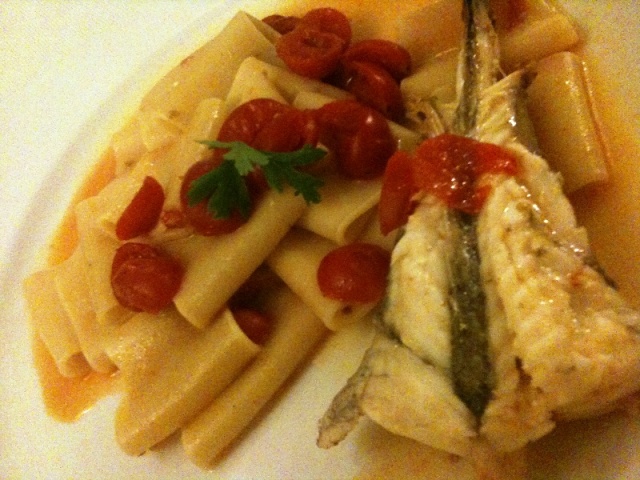 Sul primo la scelta è caduta sui paccheri, conditi con sugo con rana pescatrice oppure con frutti di mare.