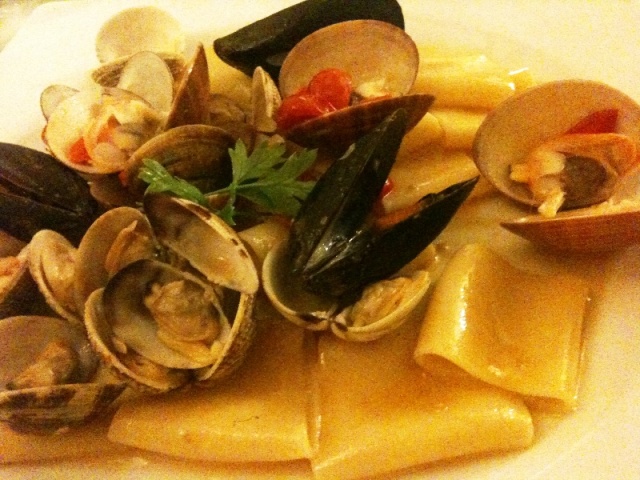 A dire il vero Faicchio è una delle piazze sannite più aperte alla contaminazione marina, ma mai si era osato tanto, puntando tutto sul pescato del giorno. Infatti, tra le prime caratteristiche del locale ecco la voce di Elena, moglie di Luigi di origini ucraine. Il consiglio: non scegliere alla carta, elencando l’offerta di pesce del giorno, da cui in genere si da il via ad un ampio ventaglio di proposte per l’antipasto. La sera in cui abbiamo fatto visita, una domenica, dopo di una piccola crudità (cannolicchi, fasolari e taratufi) c’è stato servito dell’ottimo pesce bandiera marinato, un tenero e gustoso polipo all’insalata, alici fritte e marinate, cannolicchi gratinati, seppia con melanzane e peperoni finendo con le classiche cozze.