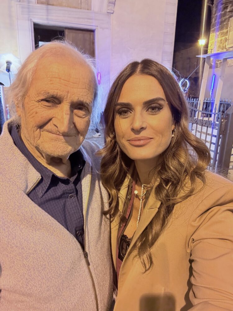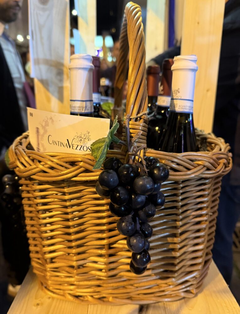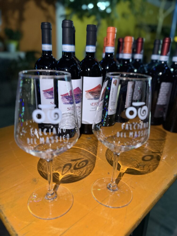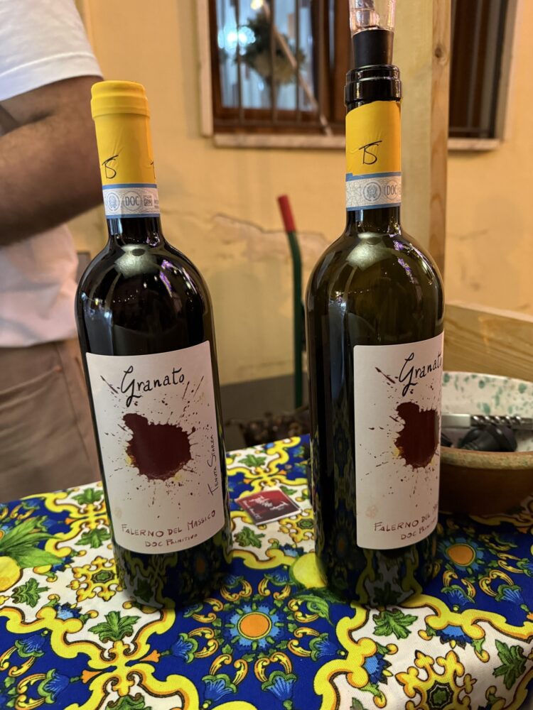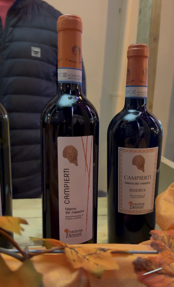 Dopo il convegno le strade del borgo si sono riempite di voci, musica e profumi. In quell’atmosfera ho incontrato Gennaro Papa, ottantacinque anni, memoria storica del vino locale e simbolo autentico del Falerno Fest. Pittore e viticoltore, mi raccontava di quando la festa richiamava più di diecimila persone e il vino era soprattutto occasione d’incontro. Tra le bottiglie in degustazione, una mi ha colpita in modo particolare: l’etichetta riproduceva un suo dipinto, a unire gesto creativo e linfa della terra, memoria e presente.