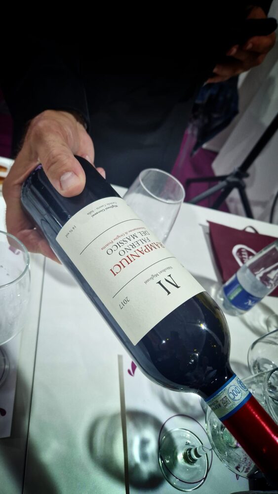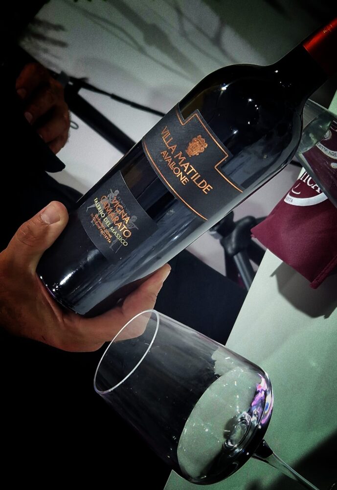 A raccontare il vino c’è Maria Ida Avallone, seconda generazione, che con il fratello Tani ha portato avanti l’azienda. Da un paio d’anni il cambio generazionale è avvenuto con successo, ad assicurare continuità al futuro, al fianco di Maria Ida e Tani, ci sono Maria Cristina alla guida enologica e Francesco Paolo jr. responsabile dei mercati esteri. “Vigna Camarato è il nostro vino del cuore. Papà ci raccontava della bellezza di questa vigna che doveva essere curata con grande amore. Proprio da questo sentimento, (da c’ammore) abbiamo coniato “Camarato” la vigna dell’amore. Siamo nella parte più a nord dell’Ager Falernum sessano. L’azienda ha le sue radici tra Sessa Aurunca e Cellole. Da 1 ettaro di vigna circa arriva questa riserva di Falerno 2018 che è un’anteprima. Sarà in distribuzione non prima di un anno. 90% aglianico e 10% saldo piedirosso. Viti di circa 60 anni. Rese per ettaro sempre più basse (vendemmia 2024, soltanto 22 q./ettaro per circa 2000 bottiglie). Il vino affina in barrique di rovere di Allier per 12/18 mesi (1/3 nuove, 1/3 secondo passaggio, 1/3 terzo passaggio) e riposa in bottiglia a maturare almeno per 12/18 mesi. L’utilizzo moderato del legno nuovo è segno della nostra volontà di rispettare al massimo vitigni, territorio e storicità”.