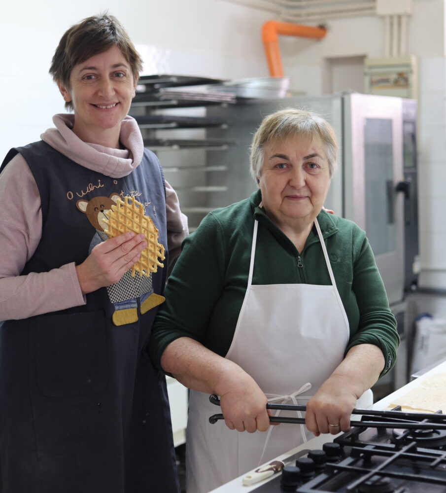 Mi fermo anche io a provare. Leonilde mi passa il suo ferro: è pesantissimo, davvero. Serve forza, ritmo ed esperienza. Lei lo usa da una vita e riesce a cuocere anche cinquanta pizzelle di seguito, mantenendo costanza e precisione. Non è un lavoro semplice, tanto che spesso in laboratorio si danno il cambio. La tradizione, per essere portata avanti, ha bisogno anche di rispetto per chi la custodisce ogni giorno.