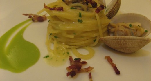 Fedelino con vongole e tartufi di mare con passatina di piselli e croccante di pancetta