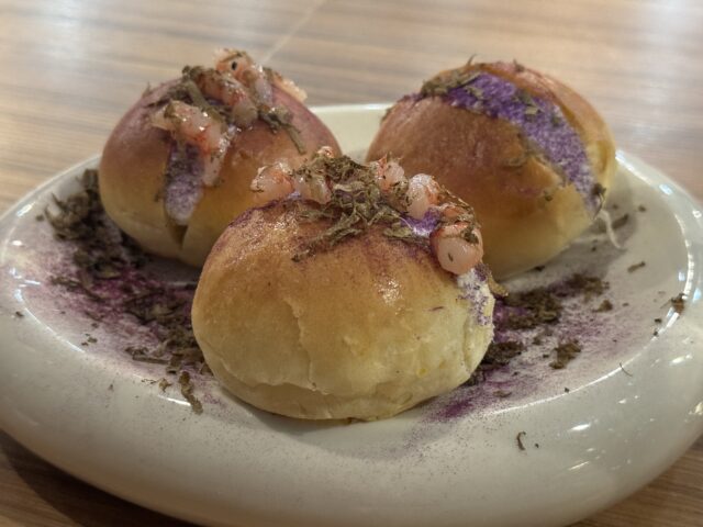 Maritozzo: Crema di Ricotta di Bufala, Polvere di Patate viola Tartare di Gambero rosa, Scaglie di Tartufo fresco