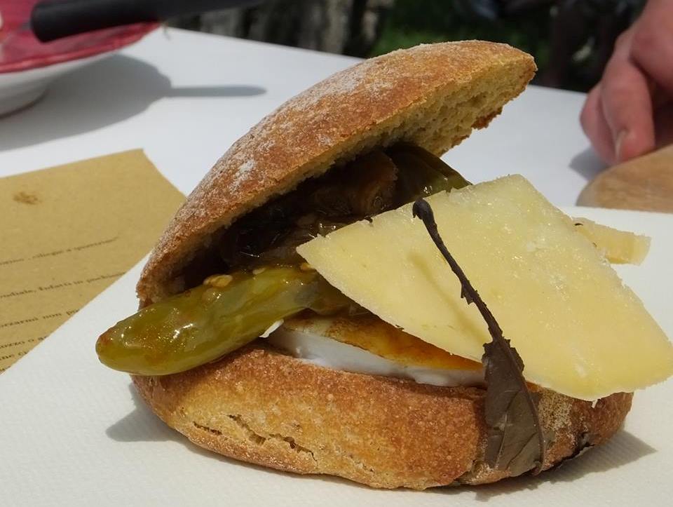 Così, di buon mattino, come nelle migliori tradizioni contadine, Giovanni Mariconda, irpino e uomo della terra porta al pic nic A cott’ e pane. Un antico pane di mais cotto nelle foglie di castagno che nel contenerlo finivano anche con lo svolgere l’inconsapevole funzione di carta forno, farcito con un uovo ad occhio di bue capovolto peperoncini di fiume padellati con pomodorini e due fette di caciocavallo. Un morso antico dove nello schiacciare il panino il rosso dell’uovo si rompe e riconferisce umidità al pane di mais per sua natura greve dopo qualche ora. Superlativo.