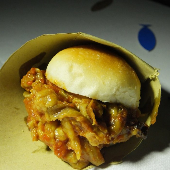 Altro luogo altro panino. Al Bikini Danilo Di Vuolo si presenta con un panino con la parmigiana. Così, semplicemente. Messo lì in un coppetto di carta paglia. Così come a volte lo abbiamo desiderato sugli spalti del San Paolo osservando il nostro vicino che lo addentava. Così come ce lo faceva mammà. Buono come la mamma.