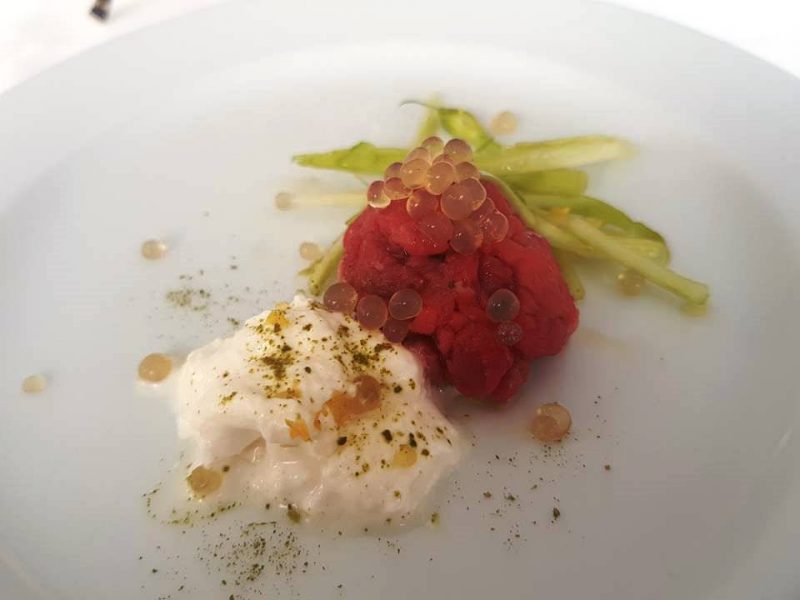Tartare di manzo con perle di colatura di alici, stracciatella e puntarelle