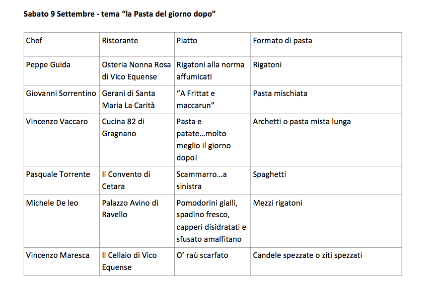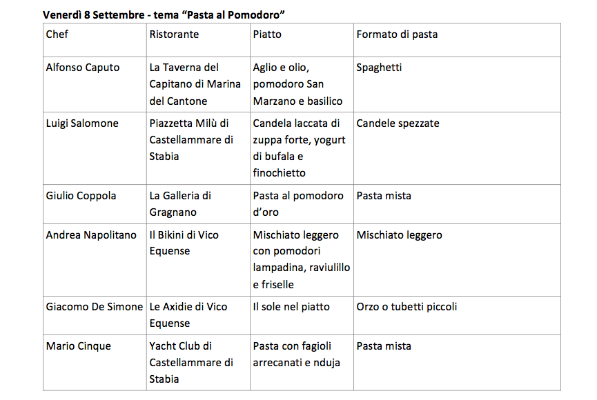 Sono dodici i grandi chef del territorio che dall’8 al 10 settembre a Gragnano interpreteranno la pasta IGP, abbinando i diversi formati a pomodori selezionati tra le migliori produzioni campane e alle ricette proposte.