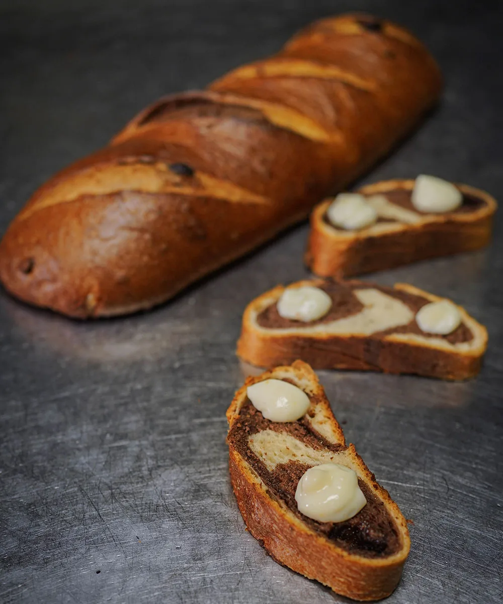 In impastatrice, impastare insieme la biga, la farina, il lievito e l’acqua. Una volta che l’impasto risulterà incordato, inserire lo zucchero, il sale e successivamente unire il burro in due riprese. Passare in prima velocità ed aggiungere il cioccolato e le arachide caramellate. Una volta concluso l’impasto, dividerlo a metà, reinserire una parte nell’impastatrice ed aggiungere la ganache al cioccolato. Lasciar lievitare i due impasti separati per circa un’ora. Spezzare in pezzi da 400 g e lasciar riposare per ulteriori 20 minuti. Stendere a mano i panetti ed aggiungere le arachidi caramellate e il cioccolato. Unire l’impasto bianco all’impasto scuro, formare un un filone e lasciar lievitare per circa 2 ore. Incidere e infornare a 210 °C.