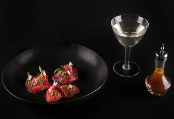 Aggiungere l’agar agar – nelle proporzioni di 1\100g. Una volta portato ad ebollizione lasciar freddare il pomodoro, dopodichè frullare e setacciare. Mettere il contenuto in una sac a poche e tenerlo da parte per la composizione e il servizio.