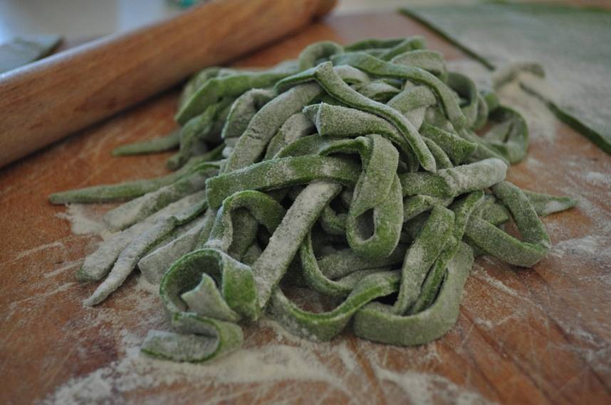 Stendere la sfoglia con il mattarello in uno spessore di mezzo centimetro scarso, spolverando continuamente la spianatoia e la sfoglia. Tagliare la sfoglia ottenuta in due metà, spolverare la superficie con altra farina, fare almeno tre pieghe per ogni sfoglia e praticare una seri di tagli trasversali ad intervalli regolari di circa mezzo centimetro. Man mano che si taglia la sfoglia, srotolare le fettucce ottenute e spolverarle con altra farina evitando che si attacchino.