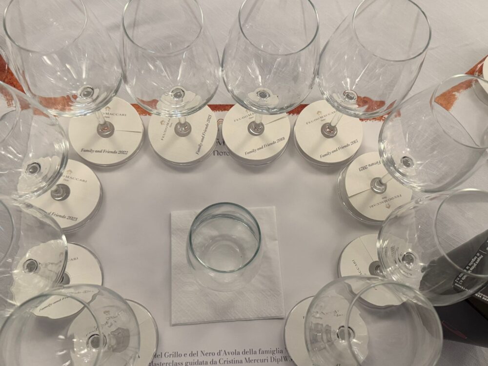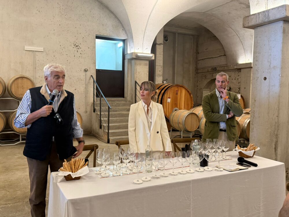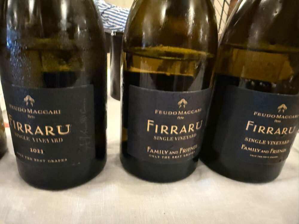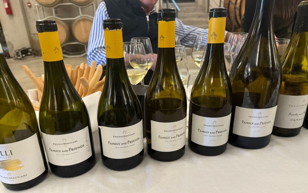 Antonio e Amedeo Moretti e Cristina Mercuri tengono la degustazione nella bella cantina di Feudo Maccari. Prima dell’arrivo di Antonio Moretti quasi non c’era uva grillo in questa zona affascinante della Sicilia, ma quasi solo Nero d’Avola. Nasce così l’idea di piantare questo vitigno seguendo un vecchio proverbio “grillo a mare e cataratto in montagna”