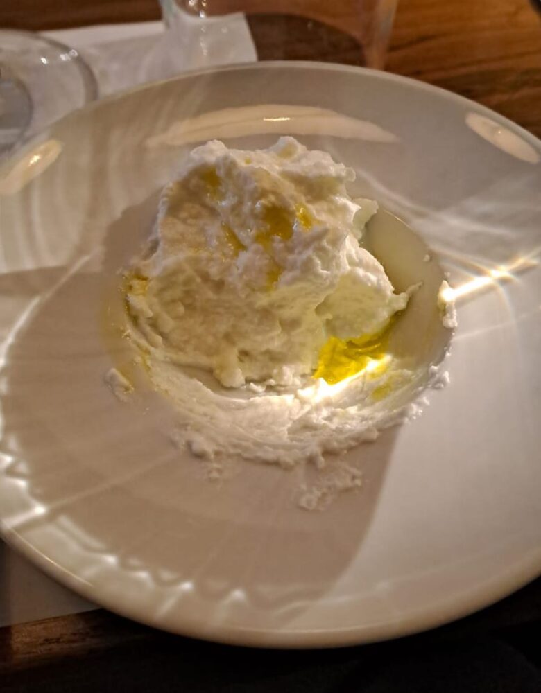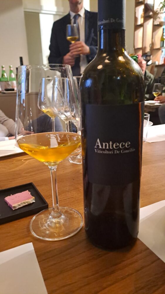 Alla sapidità del vino, viene accostata per contrasto l’acidità della robiola di Tenuta Principe Mazzacane, una vera esplosione di gusto e freschezza. Concludiamo con Antece 2022 dell’azienda De Conciliis, di Prignano Cilento, che si trova in un terroir molto simile a quello di Casebianche. Questo Fiano fa macerazione in anfora e la sua sapidità è ancora più marcata.