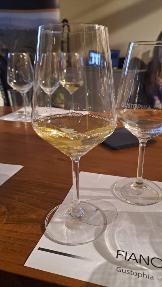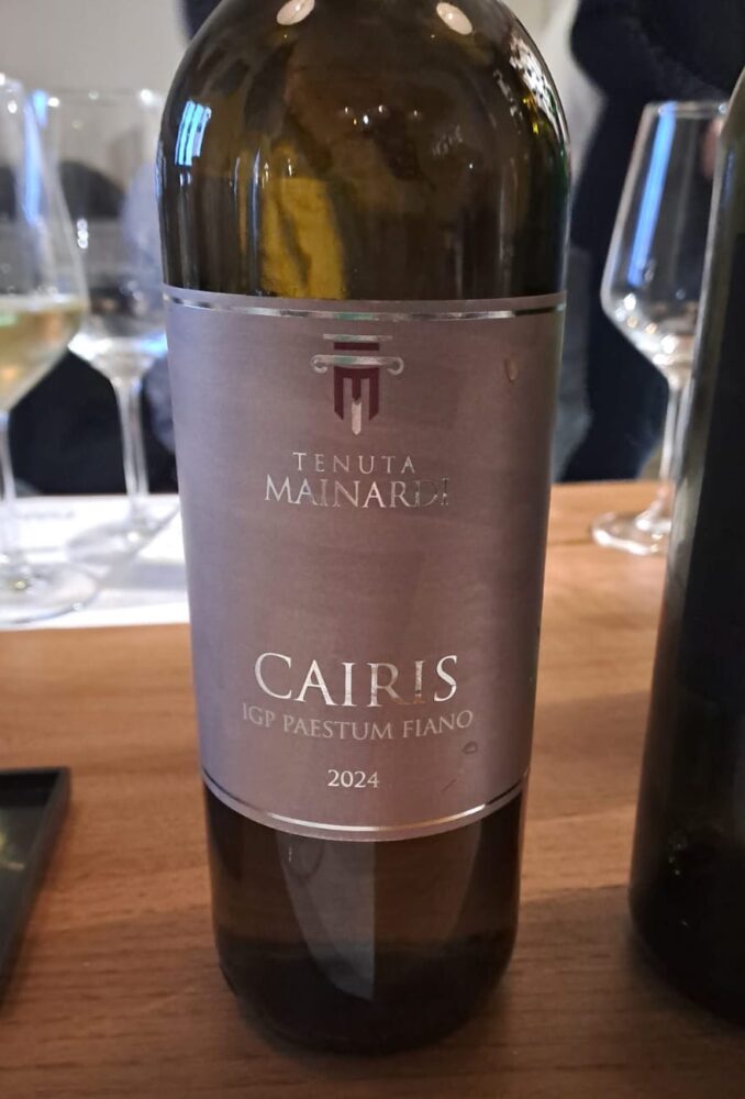 Si comincia con tre aziende produttrici di Fiano cilentano, provenienti da diverse zone. Il primo assaggio è il Cairis 2024 di Tenuta Mainardi, delicato ed erbaceo al naso, verticale e acido in bocca, tipico di un vino prodotto nel territorio dei Monti Alburni, marcatamente calcareo.
