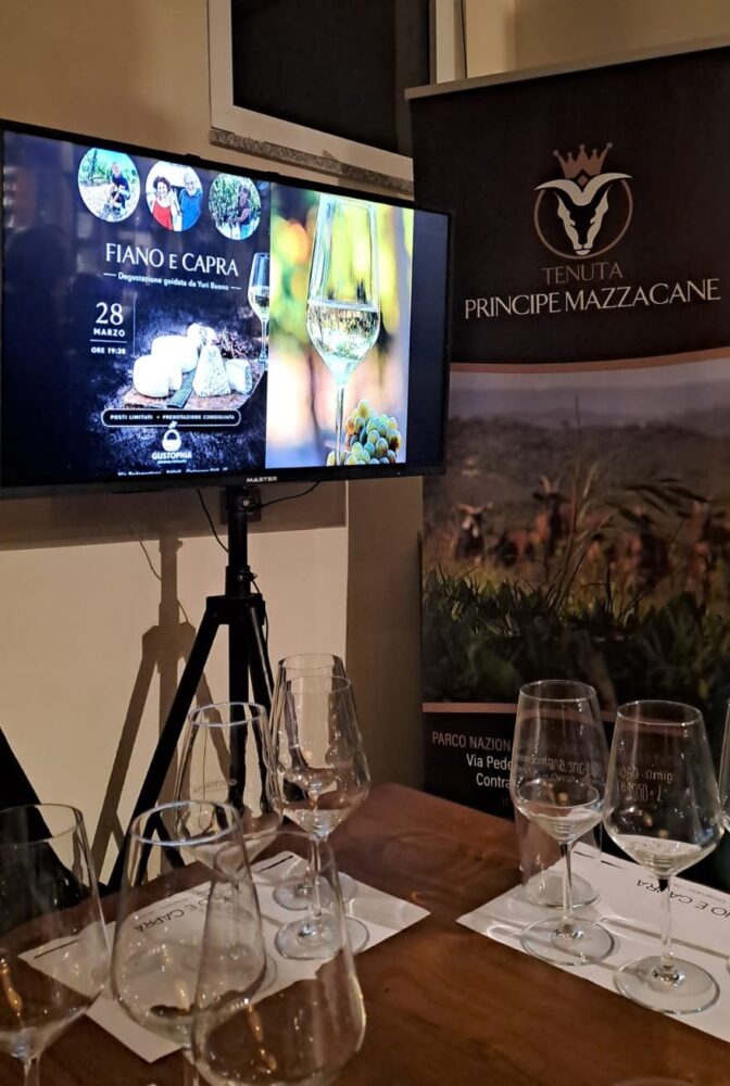 Fiano e Capra. Un connubio di gusto e territorio. Siamo in Cilento e precisamente ad Omignano, da Gustophia, la dispensa di Tenuta Principe Mazzacane, azienda produttrice di formaggi di capra.