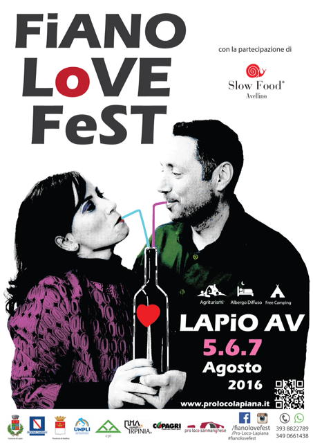 Ritorna anche quest’anno l’atteso evento irpino FIANO LOVE FEST. Tre giorni di musica, arte, eno-gastronomia, cultura e divertimento vi aspettano a Lapio il 5-6-7 agosto 2016. Giunta alla VII edizione, la manifestazione è organizzata dalla Pro Loco Lapiana con il patrocinio ed il concorso del Comune di Lapio, la collaborazione della Pro loco Sanmanghese e Slow Food Avellino, il patrocinio morale della Regione Campania, di Enti ed Istituzioni varie, dell’UNPLI e dell’EPT.