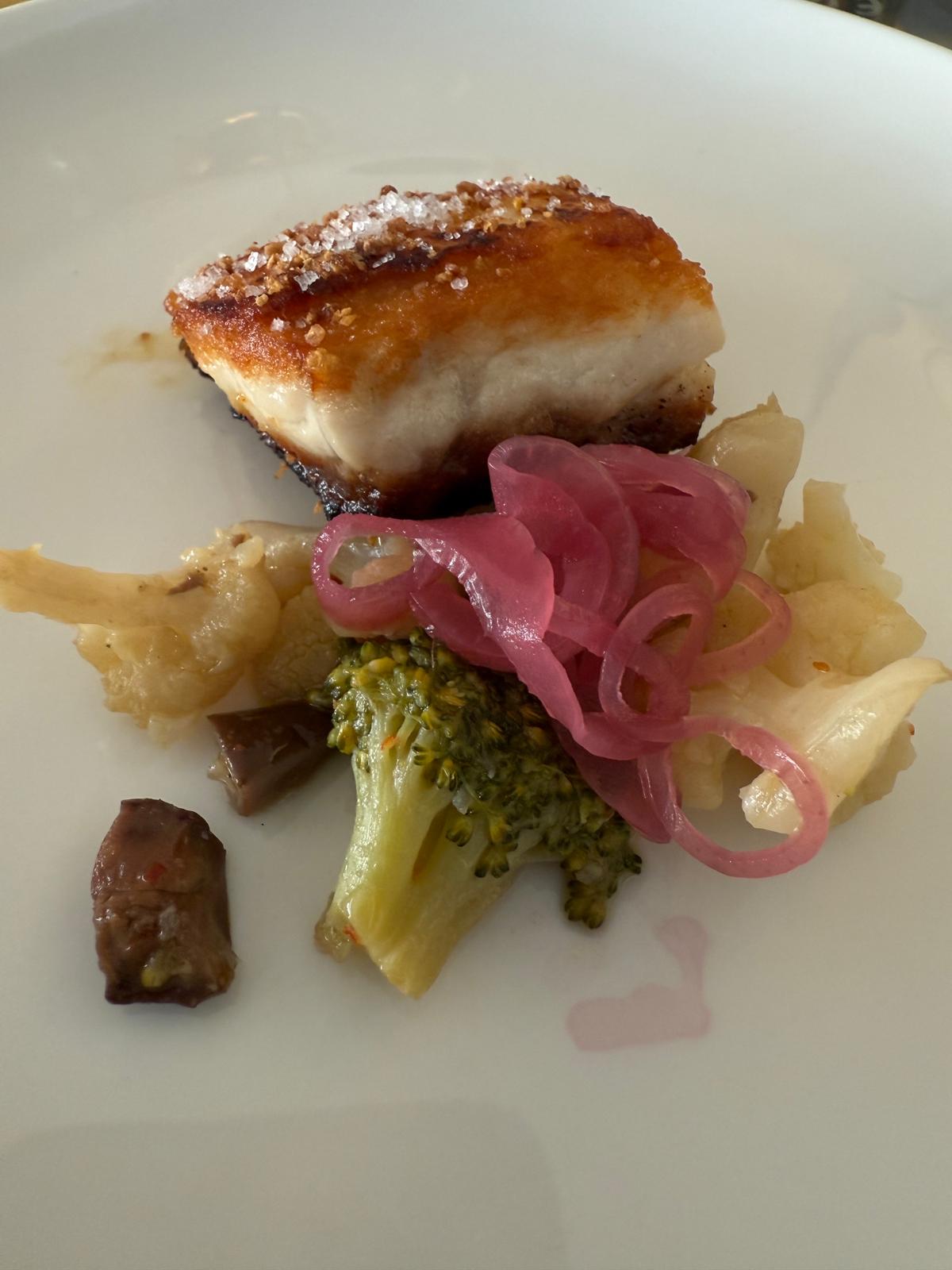 Come secondo filetto di branzino scottato in crosta di fichi, con chutney, cavolfiori e broccoli spadellati: cottura impeccabile e armonia nei sapori con una spinta vivace molto interessante. Un piatto che, da solo, vale il viaggio.