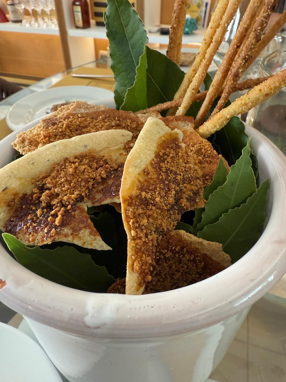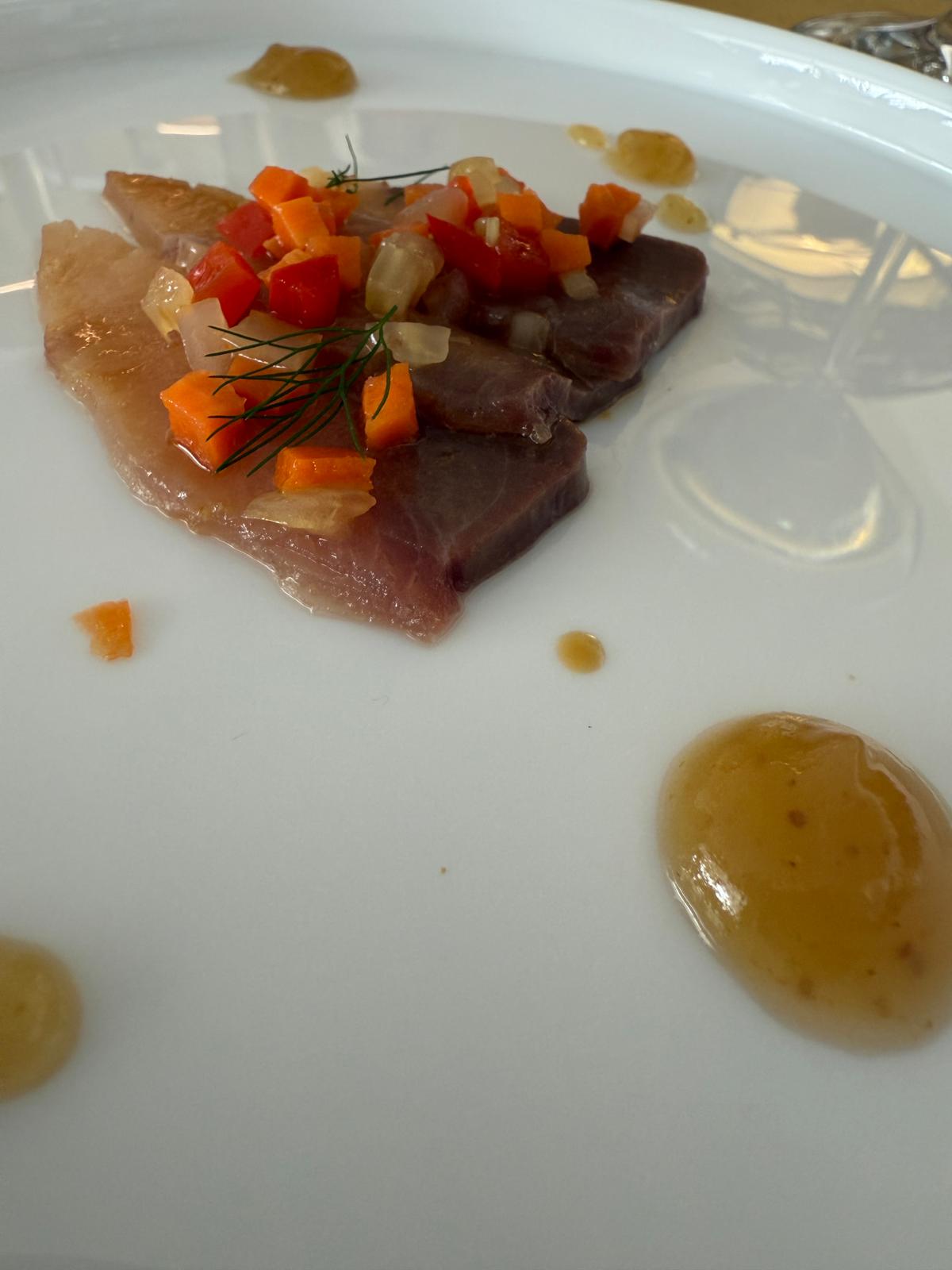 Il percorso degustazione, dopo le coccole iniziali dell’entrèe, si apre con un maki di sfoglia di fico con tonno rosso e peperone crusco: equilibrio riuscito tra dolcezza e sapidità.